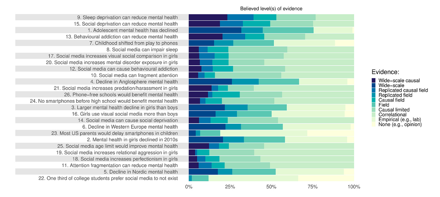 Als er doorgevraagd werd, niet of er er mogelijk een relatie kon bestaan, dan liet ook de grote meerderheid van deze selecte wetenschappers zien dat er voor de meeste causale claims over de relatie tussen sociale media en mentale gezondheid (nog) geen overtuigend bewijs is.